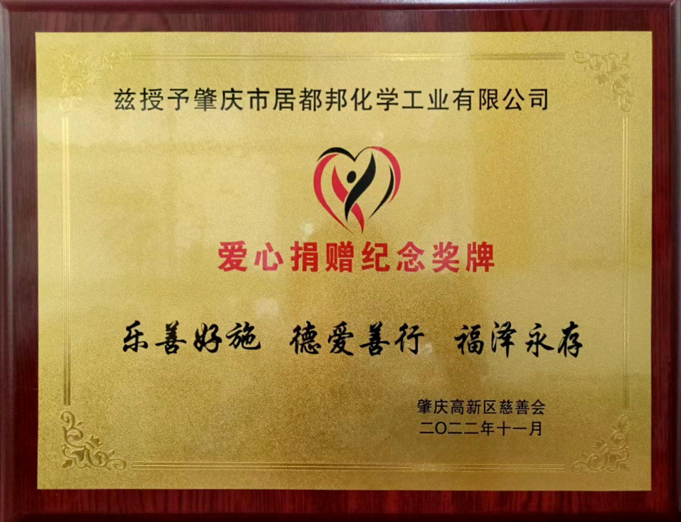 11月16日,“奉獻(xiàn)愛心力量,彰顯企業(yè)擔(dān)當(dāng)”,肇慶市高新區(qū)愛心慈善會(huì),為肇慶市居都邦化學(xué)工業(yè)有限公司授予《愛心捐贈(zèng)紀(jì)念獎(jiǎng)...